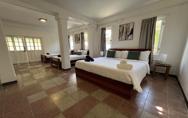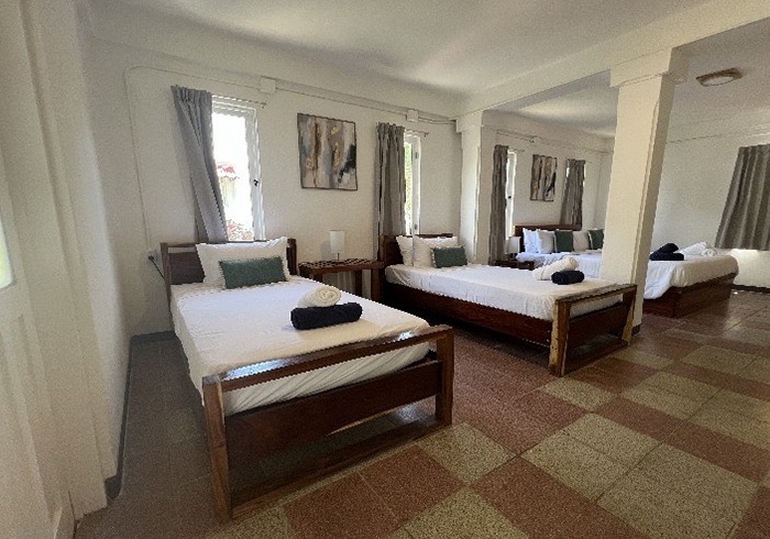 Our Family Twin room is the perfect space for those traveling in a group or with family. It features a comfortable double bed and twin beds, ensuring comfort and rest for everyone. It includes a private bathroom with complimentary toiletries, free Wi-Fi, and large windows that allow natural light to fill the room, creating a warm and cozy atmosphere. Ideal for those seeking a pleasant and relaxing stay surrounded by nature.
